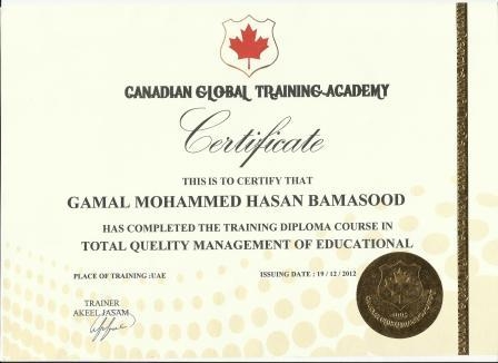 يهنئ ويبارك إداريو ومعلمو وعاملو مدارس النور الأهلية الأستاذ جمال بامسعود المشرف العام على مدارس النور لحصوله على دبلوم الإدارة التربوية الشاملة - أي في جودة الإدارة التعليمية - من الأكاديمية العالمية الكندية للتدريب وكذلك شهادة من المركز الاستشاري العالمي للتدريب بإشراف وتعميد وزارة التربية والتعليم بالمملكة العربية السعودية وهذه صور من الشهادات مع سيرة ذاتية لأستاذه المدرب القدير الدكتور العراقي عقيل جاسم