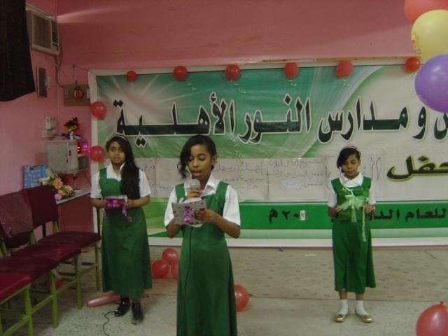 | | |  من ضمن الأنشطة الثقافية والتعليمية للجانب الثقافي بمدارس النور الأهلية أقيم الحفل التكريمي للطلاب الأوائل للفصل الدراسي الأول بقسم (2-4) بنات يوم الإثنين الموافق 17/02/2014م حيث تم تكريم الطلاب الأوائل بالشهادات والجوائز وقد أقيم الحفل بقاعة مدارس النور الأهلية وذلك بمناسبة تفوقهم في الفصل الدراسي الأول , وقد تضمن الحفل فقرات وبرامج منوعة من أناشيد وتمثيلية خلال الحفل وذلك بحضور جميع المعلمات والإداريات . وقد كانت مشاعر الطلاب لا توصف حيث غمرتهم الفرحة والسعادة والسرور والبهجة لما حققوه من نتائج خلال الفصل الدراسي الأول .