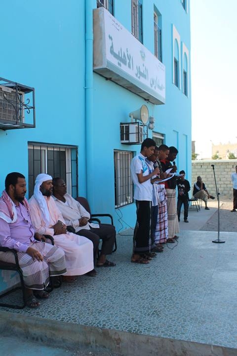 | | |  أقيم يوم الاربعاء الموافق 26/3/2014م حفل تكريم الفصل الأول لفرع مدارس النور الأهلية . حيث بدأ الحفل بتلاوة عطرة من القران الكريم ثم بحديث من أحاديث المصطفى صلى الله عليه وسلم . بعدها رحب شباب النور الحاضرين بانشودة ترحيبية تلاها كلمة المشرف العام الاستاذ جمال بامسعود . وقد تنوع الحفل بين كلمة الطلاب وانشودة وحوار إلى أن ألقى كلمة الإدارة الاستاذ سعيد صالح باكرشية مدير فرع مدارس النور الاهلية ليتم بعدها تكريم أوائل الطلبة في الفصل الدراسي الأول والطلاب المثاليين والفائزين بدوري المدرسة لكرة القدم وأيضا تم تكريم المرشد والمعلم المثاليين وكذلك الصف المثالي . وبعد انتهاء الحفل التكريمي أخذ الطلاب إلى شارع الستين لتنفيذ نشاط اليوم الرياضي . وقد كان الطلاب في غاية البهجة والسرور .