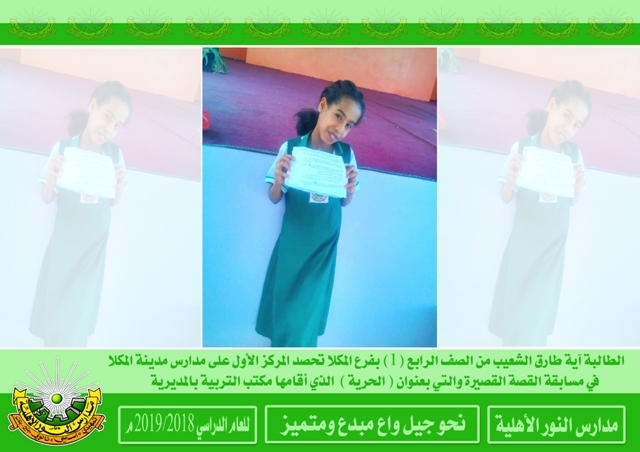 تحصلت مدارسنا على المركز الأول على مستوى مدارس مدينة المكلا في مسابقة القصة القصيرة ضمن برنامج المسابقات اللاصفية الخاصة بمدارس البنات والذي يقيمه مكتب التربية والتعليم بالمديرية وقد مثلت مدرستنا في هذه المسابقة الطالبة آية طارق الشعيب من الصف الرابع (1) فرع المكلا بقصة قصيرة حملت عنوان ( الحرية ) والتي نالت استحسان لجنة التحكيم والحاضرين . رؤية المدرسة نحو جيل واع مبدع ومتميز