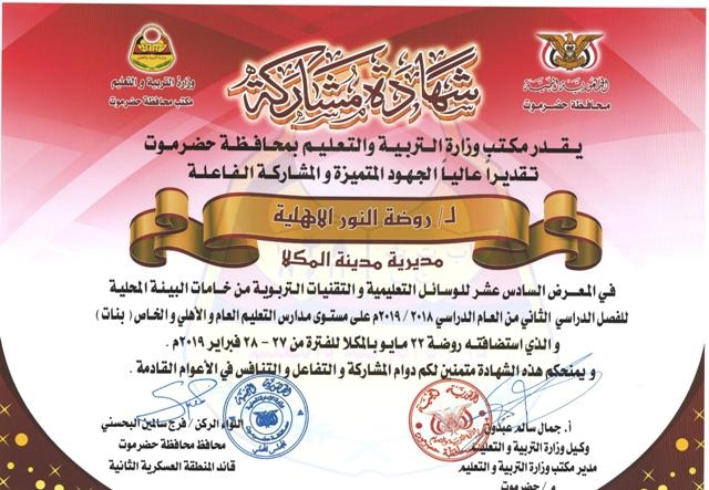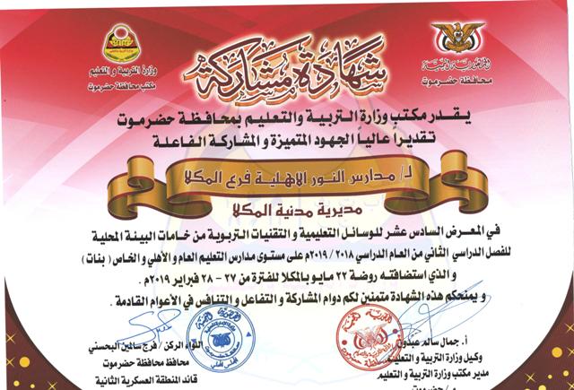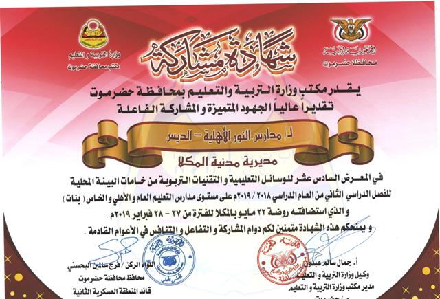 تحصلت مدارس النور الأهلية على عدد ثلاث شهادات مشاركة من مكتب التربية والتعليم بمحافظة حضرموت وذلك تقديراً للجهود المتميزة والمشاركة الفاعلة في المعرض السادس عشر للوسائل التعليمية والتقنيات التربوية من خامات الببيئة المحلية للفصل الدراسي الثاني من هذا العام ( بنات ) . جدير بالذكر فإن المدرسة قد شاركت في هذا المعرض بثلاثة أجنحة جناح فرع الديس وجناح فرع المكلا وجناح رياض الأطفال . رؤية المدرسة