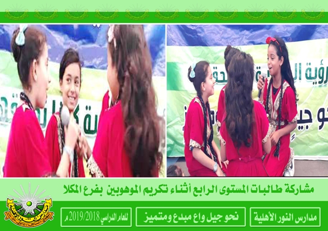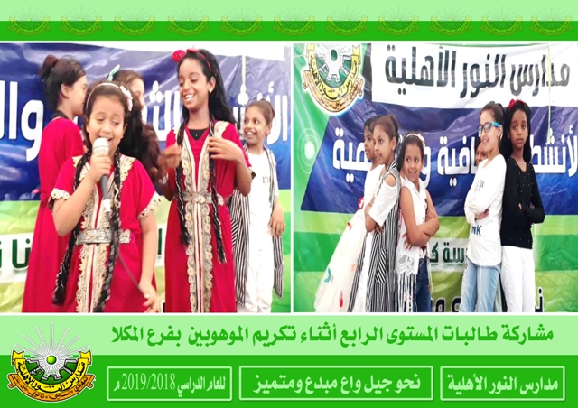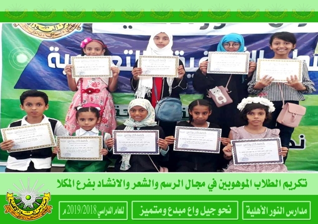 كرمت مديرة مدارس النور الأهلية بفرع المكلا الأستاذة ميمونة دعكيك بمعية الأستاذة مها عبدالله المشرفة الاجتماعية بالفرع الطلاب الموهوبين في مجال الرسم والشعر والانشاد وتأتي هذه الخطوة في إطار اهتمام إدارة المدرسة بالموهوبين وتنمية مواهبهم كان ذلك صباح يوم الخميس الماضي بمنى فرع المكلا .
