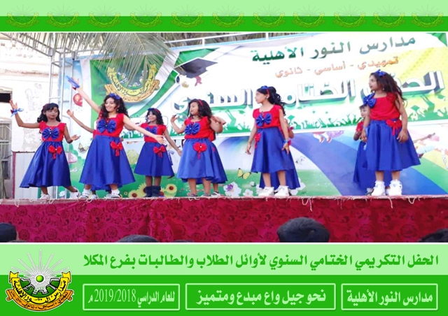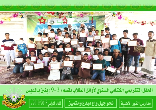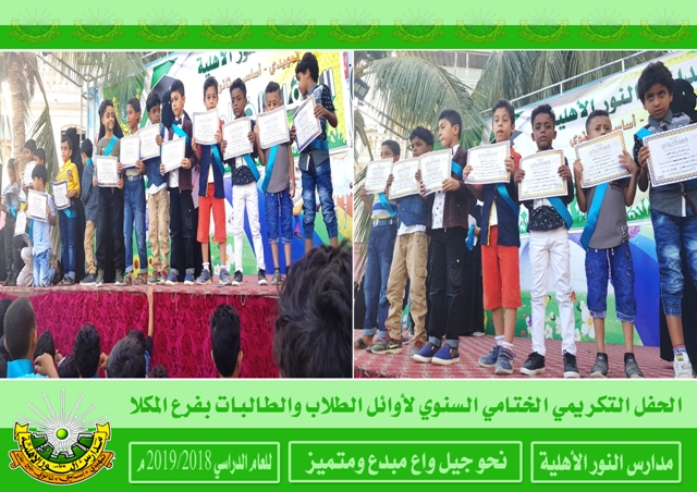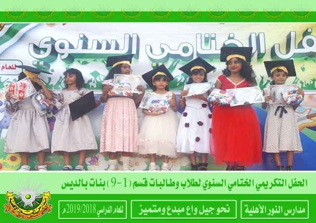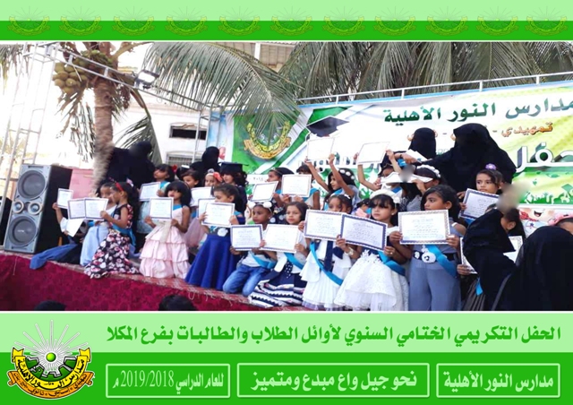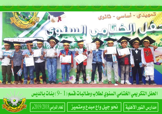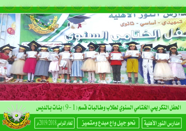 | | |  أختتم العام الدراسي 2018/2019م لمدارس النور الأهلية بالحفلات التكريمية الختامية السنوية حيث كرم في هذه الحفلات المعلمين والمعلمات والإداريين المبرزين والطلاب والطالبات الأوائل فألف ألف مبارك لطلابنا النجاح والتفوق ومزيداً من التقدم والعطاء