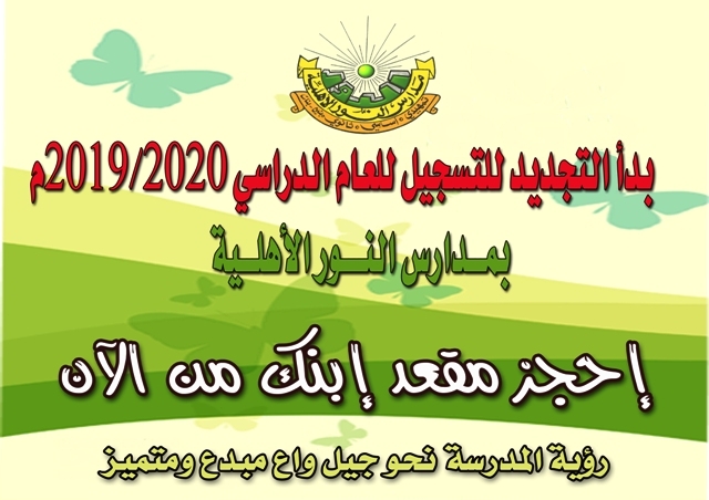 تعلن مدارس النور الأهلية عن بدء التجديد للتسجيل للعام الدراسي 2019/2020م وذلك يوم الأحد الموافق 21/7/2019م فعلى الراغبين في تسجيل أبنائهم وبناتهم سرعة التوجه صباحا إلى مواقع التسجيل بالفروع التالية : فرع الديس - الغويزي بجوار فرزة الشحر ت/ 306044-319346 فرع المكلا - أمام البنك المركزي - خلف مستشفى الهيا ت/ 306498-380868 فرع إمبيخه - بجوار مسجد الرحمن في الجهة المقابلة لمؤسسة القلب بالضيافة ت/ 321229 وذلك كل أيام الأسبوع ماعدا الجمعة والسبت للأهمية نرجو التعجيل في تجديد تسجيل أبنائكم وبناتكم والأولوية لمن يسجل أولا إدارة المدرسة