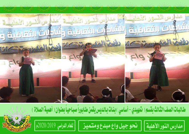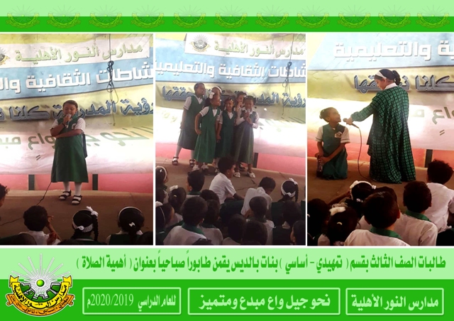 أقام طالبات المستوى الثالث بقسم ( تمهيدي - أساسي ) بنات بالديس صباح يوم الأحد من هذا الأسبوع طابوراً صباحياً حمل عنوان ( أهمية الصلاة ) حيث اشتمل الطابور على العديد من الفقرات الهادفة والمتميزة . إعداد الإعلام التربوي بالمدرسة رؤيتنا : نحو جيل واع مبدع ومتميز