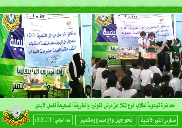 | | |  بتميل من اليونيسف منظمة الطفولة تنفيذ مكتب الصحة حضرموت الساحل ( التثقيف الصحي ) أقام برنامج التواصل من أجل التنمية ( C4D) بمدارس النور الأهلية بفرع المكلا وذلك يوم الأحد من هذا الأسبوع محاضرة توعوية للطلاب عن مرض الكوليرا وكذلك الطريقة الصحيحة لغسل الأيدي والتي شارك فيها الطلاب بالتطبيق العملي .