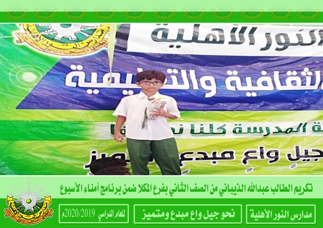كرمت إدارة مدارس النور الأهلية بفرع المكلا في الطابور الصباحي ليوم أمس الثلاثاء الطالب عبدالله الذيباني من الصف الثاني ضمن برنامج ( أمناء الأسبوع ) وذلك بعد عثوره على قطعة ذهب في دورة المياه واحتفظ بها الطالب عبدالله وسلمها إدارة المدرسة . ويأتي هذا البرنامج ضمن البرامج التربوية التي تحث الطلاب على المحافظة على الأمانة وكذلك المفقودات وإرجاعها إلى أهلها . إعداد الإعلام التربوي بالمدرسة رؤيتنا : نحو جيل واع مبدع ومتميز