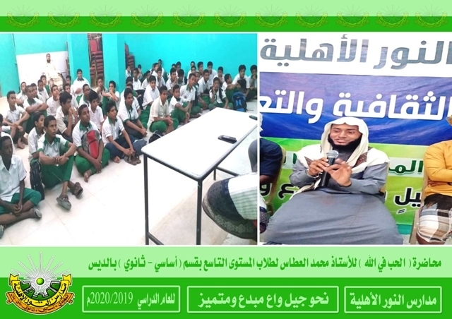 ألقيت صباح يوم الخميس الماضي بالقاعة الكبرى للمدرسة بالديس محاضرة توعوية بعنوان ( الحب في الله ) لطلاب المستوى التاسع بقسم ( أساسي - ثانوي ) بالديس وقد حاضر في هذه المحاضرة الداعية الفاضل محمد بن صالح العطاس وقد استفاد الطلاب من هذه المحاضرة خير فائدة . إعداد الإعلام التربوي بالمدرسة رؤيتنا : نحو جيل واع مبدع ومتميز