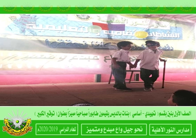 أقام طلاب الصف الأول بنين بقسم ( تمهيدي - أساسي ) بنات بالديس طابوراً صباحياً مميزاً حمل عنوان ( توقير الكبير ) حيث بدأ الطابور بآيات عطرة من كتاب الله الحكيم تلاه حديث شريف وكلمة صباحية ومشهد هادف تم التعليق عليه من قبل مرشدة الصف الأستاذة إيمان بامسعود وقد نال الطابور استحسان الحاضرين . الإعلام التربوي بالمدرسة رؤيتنا : نحو جيل واع مبدع ومتميز