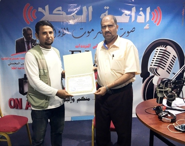 وفي ختام الزيارة قدم الأستاذ علي المرشدي مختص العلاقات والإعلام بالمدرسة شهادة شكر وتقدير من إدارة مدارس النور الأهلية لإذاعة المكلا على حسن الأستقبال ونجاح الزيارة تسلمها الأستاذ عماد بن هامل مدير قسم البرامج بالإذاعة .