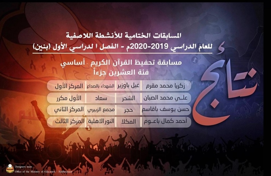 أحرزت مدارس النور الأهلية المركز الثالث على مستوى مدارس ساحل حضرموت في مسابقة تحفيظ القرآن الكريم أساسي فئة العشرين جزءاً والذي أقامه مكتب التربية بالمحافظة ضمن المسابقات اللاصفية للفصل الدراسي الأول مدارس البنين وقد مثل مدرستنا في هذه المسابقة الطالب أحمد كمال باعوم من الصف التاسع وبهذا الفوز تتقدم المدرسة بالتهنئة الخاصة للطالب أحمد ولإداريي ومعلمي المدرسة عامة بهذا الفوز والتميز ومزيداً من النجاح في المسابقات القادمة. الإعلام التربوي بالمدرسة نحو جيل جيل واع مبدع ومتميز