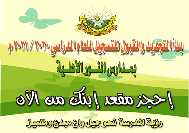 احجز مقاعد أولادك من الآن تعلن مدارس النور الأهلية عن استئناف عملية التجديد والتسجيل للعام الدراسي 2020/2021 م