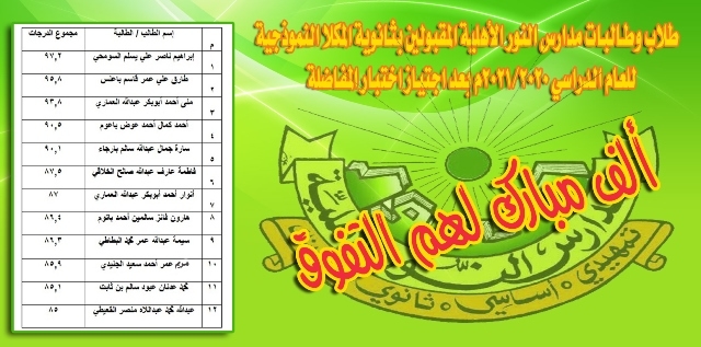 | | |  تهنئ مدارس النور الأهلية طلابها وطالباتها الناجحين في اجتياز امتحان المفاضلة وقبولهم بثانوية المكلا النموذجية لهذا العام 2020/2021م فألف ألف مبارك عليهم وعلى أسرهم هذا النجاح والتفوق وشكراً لهم ولمعلميهم ومعلماتهم وإداراتهم وأولياء أمورهم الذين بذلوا جهوداً مضنية ليحقق الطلاب والطالبات هذه المراتب الممتازة ونرفق لكم أسمائهم ونسبهم .