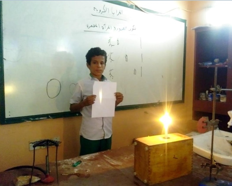 أجريت صباح يوم أمس الثلاثاء بالمختبر العلمي بقسم ( 4-9 ) بنين بالديس تجربة علمية في مادة العلوم لتكون الصور على الحائل في انعكاس المرآة المقعرة للصف الثامن (3) أداء الطالب المتميز جلال بادخن وتحت اشراف أ. عبدالله باشحري حيث وضحت التجربة كيفية تكون الصورة الحقيقية من الخيالية وكيفية تكون الصورة امام المرآة من خلفها واختلاف الصورة في حجمها حسب بعد الجسم عن المرآة في خمسة مواضع وقد استمتع الطلاب بهذه الحصة العملية واستفادوا خير فائدة .