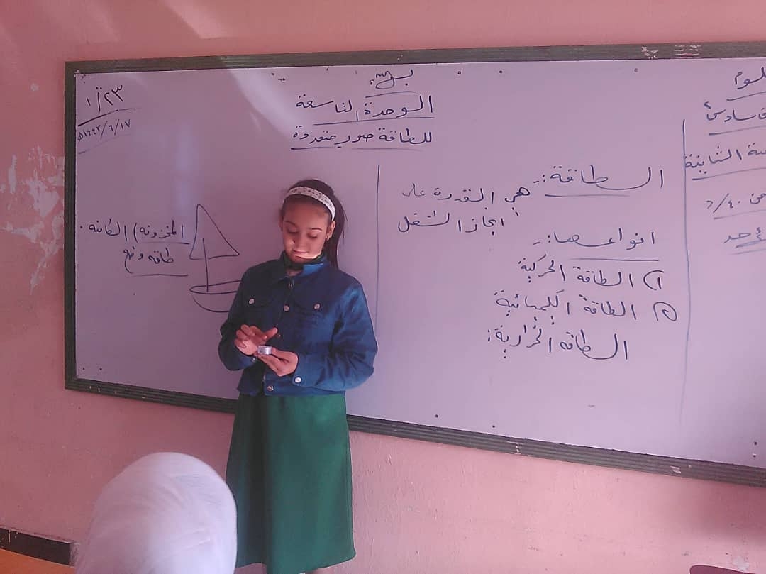 أجريت لطالبات الصف السادس بقسم ( 1-8 ) بفرع المكلا ( القصر ) تجربة علمية في مادة العلوم في درس ( للطاقة صور متعددة ) بإشراف معلمة المادة رشيدة الهندي .