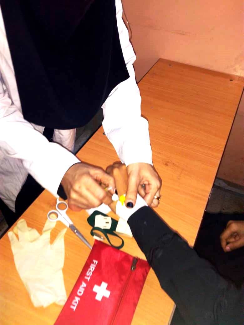 مسؤولة جماعة الاسعافات الأولية بقسم ( تمهيدي – أساسي ) بنات بالديس المعلمة سامية المعلم في تطبيق عملي لطالبات الصف الثامن في كيفية تركيب المغذية الوريدية للمريض .