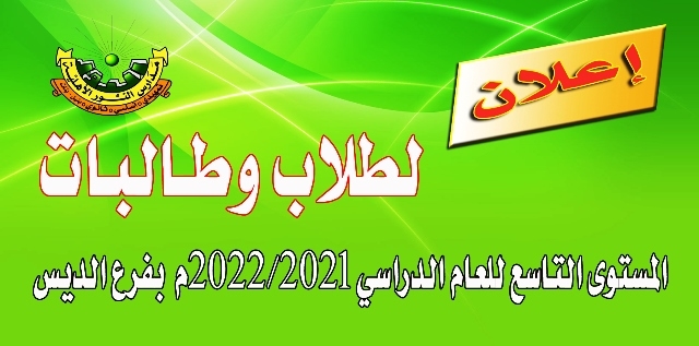 إعلان لطلاب وطالبات المستوى التاسع بفرع الديس للعام الدراسي 2021/2022 م