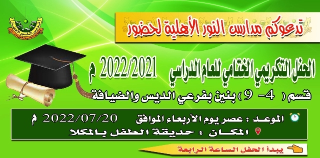 ــ دعوة حضور حفل تكريم ــ تدعوكم مدارس النور الأهلية لحضور ــ الحفل الختامي والتكريمي لطلاب قسم ( 4 – 9 ) بنين بفرعي الديس والضيافة ــ وذلك عصر يوم الأربعاء الموافق 20/07/2022 م في حديقة الطفل بالمكلا ــ حيث سيبدأ الحفل *الساعة الرابعة * رؤيتنا : نحو جيل واع مبدع ومتميز ــ ولمتابعة إعلانات وأخبار مدارس النور اﻷهلية ــ فيسبوك : www.fb.com/alnoor.schools.page ــ تلقرام : https://t.me/alnoorschools ــ انستقرام : https://www.instagram.com/alnoor.schools/ ــ يوتيوب : https://www.youtube.com/c/PrivateAlnoorSchool ــ الموقع الإلكتروني : www.alnoor-schools.com