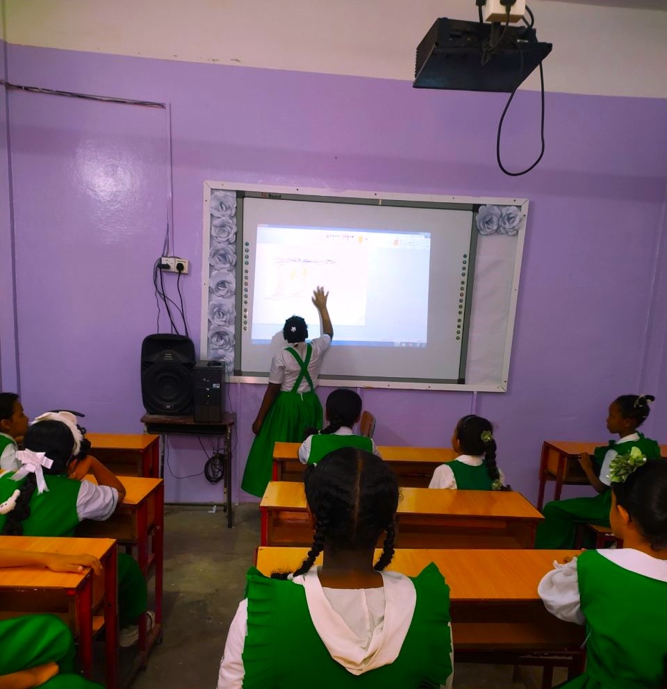 جانب من تلاميذ المستوى الأول والمستوى الثاني بنين وبنات والمستوى الثالث بنين في غرفة الحاسوب لتعريفهم بمكونات الحاسوب وجانب آخر من تطبيق عملي لتلاميذ الصف الأول والثاني بنات والصف الرابع بنين على السبورة الذكية لدرس الرسام والدفتر تحت إشراف معلمة الحاسوب الأستاذة ريم باشراحيل .