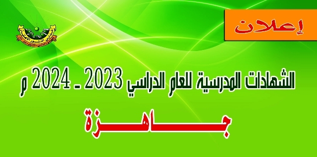 تعلن مدارس النور الأهلية فرع الأولاد بالديس أن الشهادات المدرسية للعام الدراسي 2023/2024م ستكون جاهزة يوم الأحد القادم الموافق 21/7/2024م لمن أراد صورة منها على أن يكون قد سدد ما عليه من رسوم دراسية .
