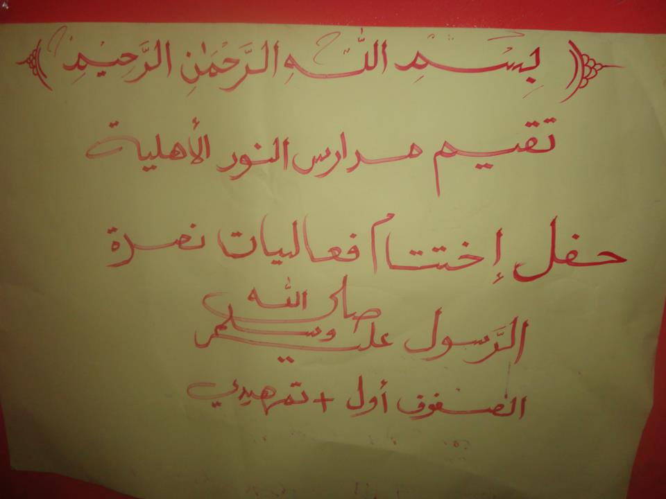 | | |  نظراً للحملة الشرسة من أعداء الأمة ضد الاسلام ونبي الاسلام سيدنا محمد صلى الله علية وسلم وضمن أنشطة الجانب الثقافي برياض ومدارس النور الاهلية أقيمت العديد من الانشطة والمهرجانات لنصرة حبيبنا صلى الله عليه وسلم وذلك في أقسام البنات كالاتي : -يوم الخميس 27/9/2012م قسم البنات تواسع الى خوامس . - يوم الأحد 3/9/2012م قسم ثواني الى روابع . - يوم الأثنين 1/10/2012م قسم تمهيدي - أول أبتدائي وقد شمل الحفل عدة فقرات وبرامج هادفة تعبر عن حبهم لرسول الله صلى الله عليه وسلم وغضبهم تجاه الفلم والرسومات المسيئهلنبينا محمد صلى الله عليه وسلم وتخلل الحفل كلمات للطلاب والطالبات وأناشيد هادفه وأنشاد جميل وبهذا تعبير من البراعم والطلاب والطالبات عن جبهم لنبيهم صلى الله عليه وسلم والدفاع عنه انثالاً لقول الله تعالى ( هو الذي أيدك بنصره وبالمؤمنين ...