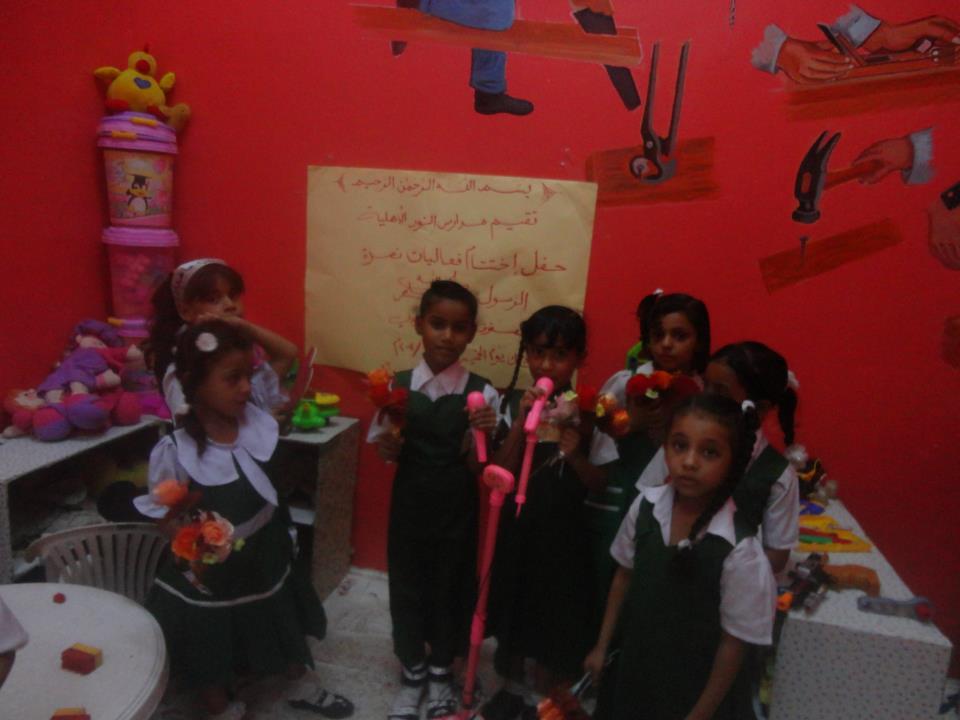 | ضمن أنشطة الجانب الثقافي برياض ومدارس النور الاهلية أقيمت العديد من الانشطة والمهرجانات لنصرة حبيبنا صلى الله عليه وسلم | | Sun 7/10/2012 |