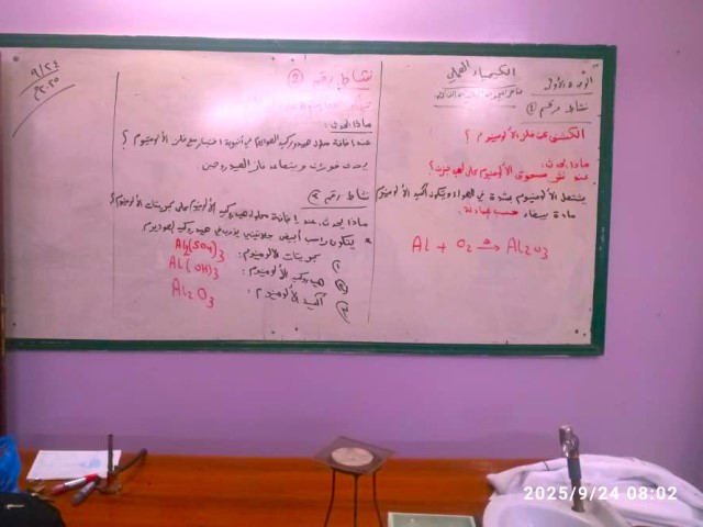 فقد نفذ طلاب الصف الثاني ثانوي نشاطاً عملياً في مادة الكيمياء بعنوان: الألومنيوم يشتعل بشدة في الهواء ويتكون أكسيد الألمنيوم الأبيض .