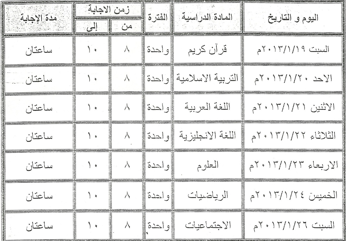 جدول سير الامتحانات التجريبية للفصل الدارسي الاول بمديرية مدينة المكلا للعام الدراسي 2012م-2013م للصف التاسع