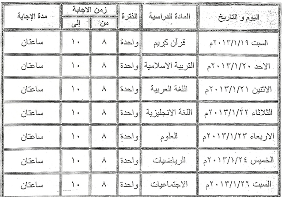 جدول سير الامتحانات للفصل الدارسي الاول بمديرية مدينة المكلا للعام الدراسي 2012م-2013م للصفوف 1-3 ( أساسي)