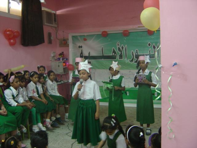 | | |  من ضمن الأنشطة الثقافية والتعليمية للجانب الثقافي بمدارس النور الأهلية أقيم الحفل التكريمي للطلاب الأوائل للفصل الدراسي الأول بقسم (2-4) بنات يوم الإثنين الموافق 17/02/2014م حيث تم تكريم الطلاب الأوائل بالشهادات والجوائز وقد أقيم الحفل بقاعة مدارس النور الأهلية وذلك بمناسبة تفوقهم في الفصل الدراسي الأول , وقد تضمن الحفل فقرات وبرامج منوعة من أناشيد وتمثيلية خلال الحفل وذلك بحضور جميع المعلمات والإداريات . وقد كانت مشاعر الطلاب لا توصف حيث غمرتهم الفرحة والسعادة والسرور والبهجة لما حققوه من نتائج خلال الفصل الدراسي الأول .