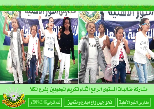كرمت مديرة مدارس النور الأهلية بفرع المكلا الأستاذة ميمونة دعكيك بمعية الأستاذة مها عبدالله المشرفة الاجتماعية بالفرع الطلاب الموهوبين في مجال الرسم والشعر والانشاد وتأتي هذه الخطوة في إطار اهتمام إدارة المدرسة بالموهوبين وتنمية مواهبهم كان ذلك صباح يوم الخميس الماضي بمنى فرع المكلا .