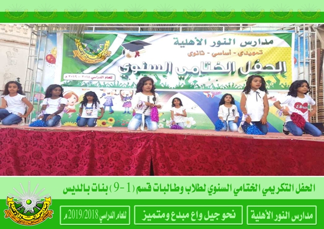 | | |  أختتم العام الدراسي 2018/2019م لمدارس النور الأهلية بالحفلات التكريمية الختامية السنوية حيث كرم في هذه الحفلات المعلمين والمعلمات والإداريين المبرزين والطلاب والطالبات الأوائل فألف ألف مبارك لطلابنا النجاح والتفوق ومزيداً من التقدم والعطاء