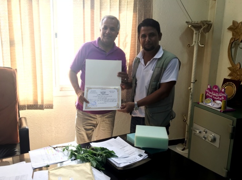 وفي نهاية الزيارة قدم الأستاذ علي المرشدي مختص العلاقات والإعلام بالمدرسة شهادة شكر وتقدير من إدارة المدرسة لمديرعام مجمع حضرموت الصناعي الأستاذ سعيد البريهي على حسن الاستقبال ونجاح الزيارة .