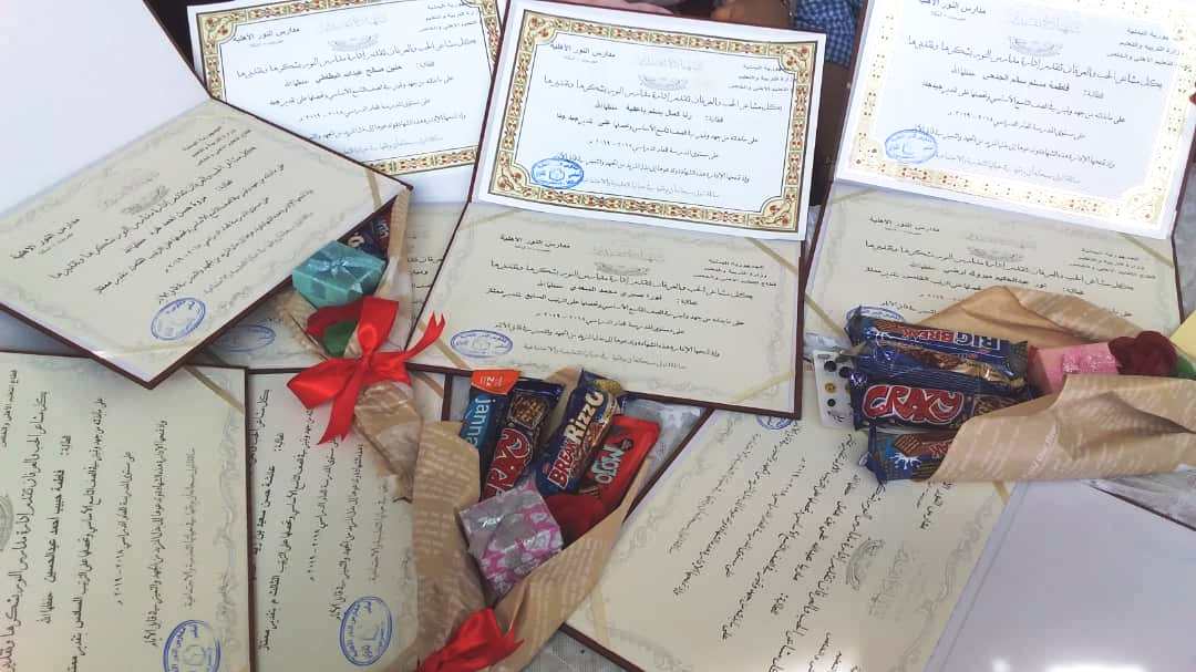 وقد اختتم الحفل بتكريم الطالبات الثلاث الأوائل وكذلك الطالبات الخريجات على نغم أنشودة التخرج أنشدتها زهرات المدرسة .