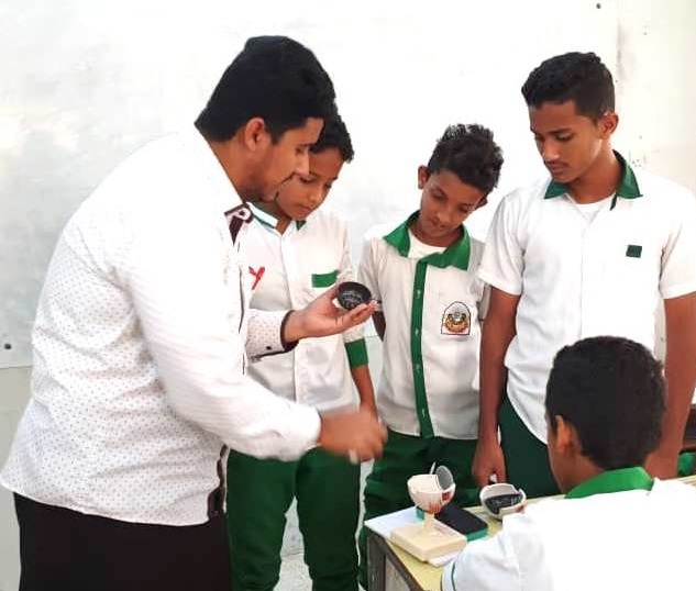 في حصة تعليمية عملية قام الأستاذ سعيد بامخير معلم مادة العلوم بفرع الضيافة بشرح درس ( كيف ترى العين الأشياء ) للصف الثامن ويهدف الدرس لتعريف الطلاب بمكونات العين والتعرف على طبقاتها وعلى تكون الصورة التي تراها العين بالإضافة إلى التطرق إلى مشكلات العين من قصر وطول النظر وكيفية معالجة هذه المشكلات عن طريق العدسات الصناعية .