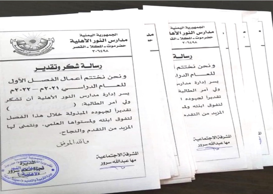 كرمت إدارة قسم الأساسي بفرع المكلا ( القصر ) صباح يوم الخميس من الأسبوع الماضي الطلاب والطالبات المتفوقين للفصل الدراسي الأول من العام الحالي كما أرسلت إدارة القسم رسائل شكر وتقدير لأولياء أمورهم متمنية لهم مزيداً من التفوق والنجاح .