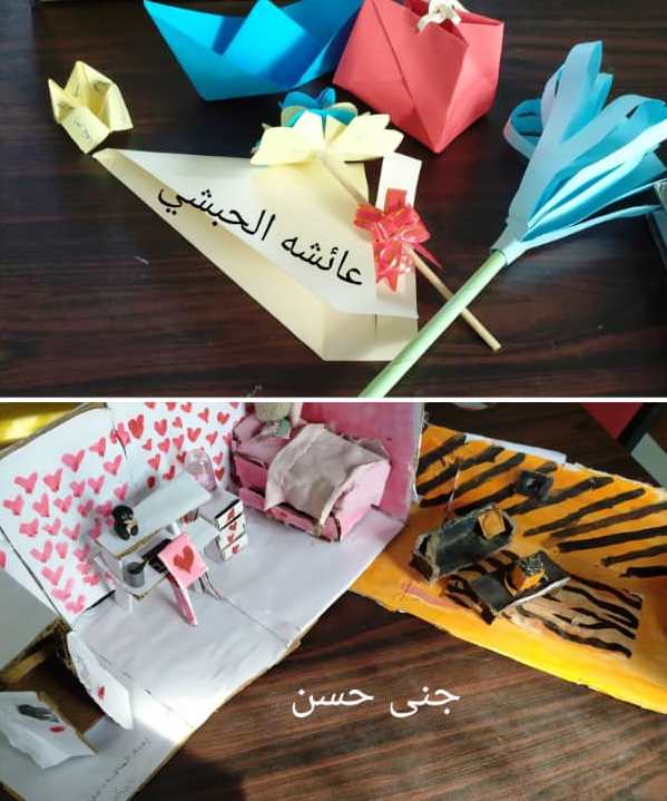 جانب من عمل طالبات الصف الرابع بقسم البنات بفرع الضيافة وبإشراف المعلمة فاطمة محفوظ ضمن فعاليات حصص النشاط كما فازت الطالبتان عائشة الحبشي وجنى حسن من الصف السابع في مسابقة الهوايات والمهارات والتي تشرف عليه المشرفة الاجتماعية بالقسم الأستاذة نوره أحمد .