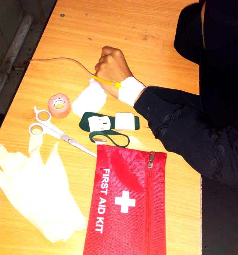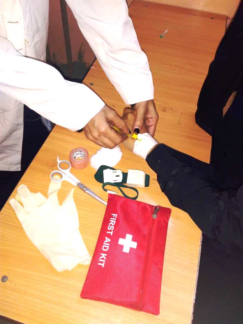 مسؤولة جماعة الاسعافات الأولية بقسم ( تمهيدي – أساسي ) بنات بالديس المعلمة سامية المعلم في تطبيق عملي لطالبات الصف الثامن في كيفية تركيب المغذية الوريدية للمريض .
