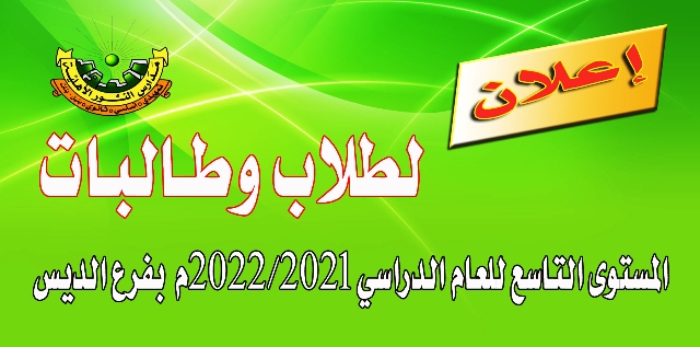 إعلان لطلاب وطالبات المستوى التاسع بفرع الديس للعام الدراسي 2021/2022 م