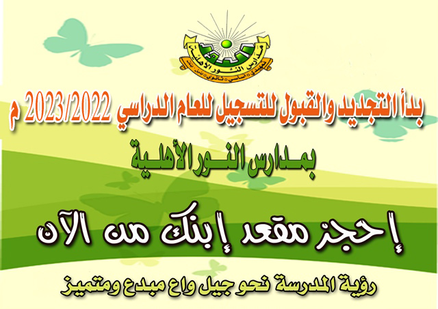 تعلن مدارس النور الأهلية لأولياء أمور التلاميذ أنه سيبدأ تجديد التسجيل من يومنا هذا الاثنين الموافق 27 يونيو صباحا