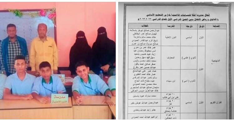 الإعلام التربوي بالمدرسة 26/10/2022م تحصلت مدارس النور الأهلية بفرع الضيافة على المركز الأول بجدارة على مدارس مديرية المكلا في المسابقة المنهجية للمستوى التاسع أساسي وبهذا الفوز ستمثل مدارسنا النور مدارس مديرية المكلا في المسابقة المنهجية للمستوى التاسع على مستوى مدارس المحافظة وتأتي هذه المسابقة ضمن برنامج المسابقات اللاصفية التي يقيمها مكتب التربية والتعليم بالمديرية لمدارس البنين للفصل الدراسي الأول من العام الجاري . وبهذا الفوز تتقدم مدارس النور الأهلية مجدداً لكل منتسبي المدرسة من إداريين ومعلمين وتلاميذ وأولياء الأمور بالتهاني القلبية بمناسبة حصول مدرستنا على المركز الأول متمنيين لتلاميذنا الفوز والتأهل في المسابقة النهائية . رؤيتنا : نحو جيل واع مبدع ومتميز - ولمتابعة إعلانات وأخبار مدارس النور اﻷهلية -فيسبوك : www.fb.com/alnoor.schools.page -تلقرام : https://t.me/alnoorschools -انستقرام : https://www.instagram.com/alnoor.schools/ -يوتيوب : https://www.youtube.com/c/PrivateAlnoorSchool -الموقع الإلكتروني : www.alnoor-schools.com