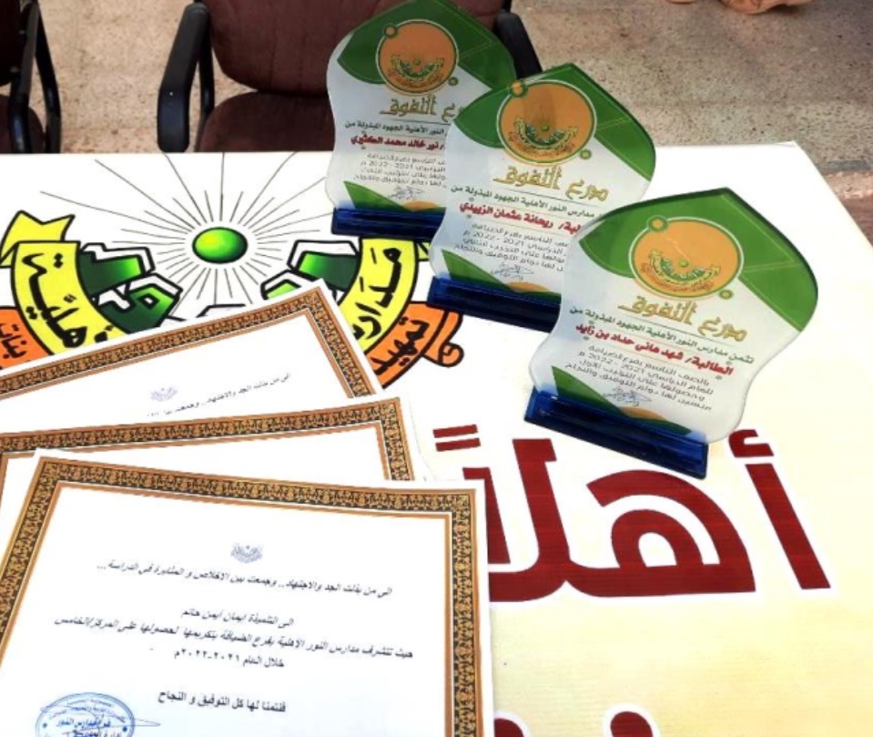 أقامت إدارة قسم ( تمهيدي – أساسي ) بنات بفرع الضيافة صباح يوم السبت الموافق 29/10/2022م حفلاً تكريمياً لتلميذات المستوى التاسع للعام الماضي 2021/2022م حيث كرمت إدارة القسم في هذا الحفل الثلاث التلميذات الأوائل بدرع التفوق فيما تحصلت بقية التلميذات على شهادات تقديرية وقد اشتمل الحفل على العديد من الفقرات المميزة تخللتها كلمة الإدارة ألقتها وكيلة القسم الأستاذة بثينة بن شملان وكذلك كلمة التلميذات الخريجات ألقتها التلميذة ريحانة الزبيدي وقد نالت فقرات الحفل استحسان الحاضرين .