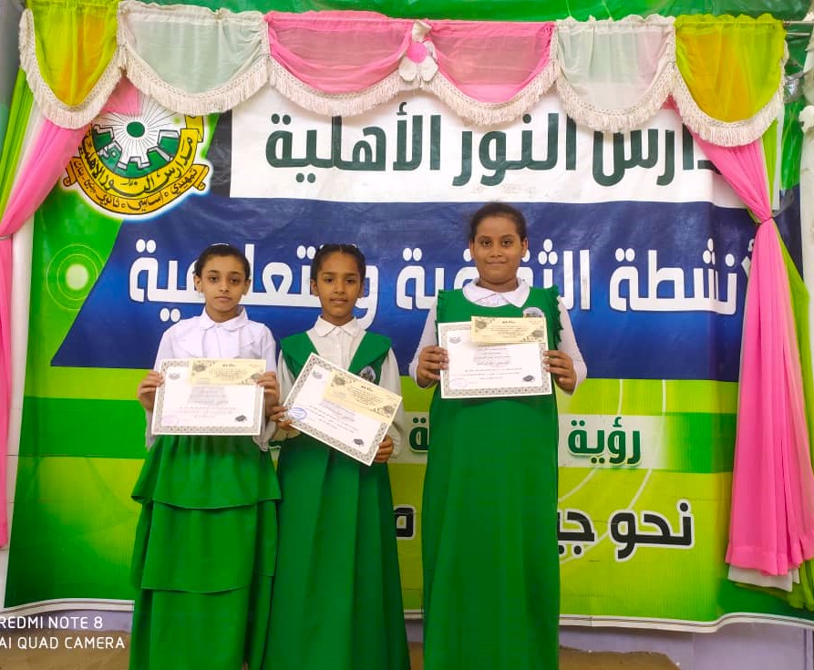 لما يحققه التحفيز والتكريم للتلاميذ المتميزين من أهمية ، ودافع لباقي التلاميذ للتميز والذي تقوم به مدارس النور ، فقد كرمت إدارة فرع المكلا ( القصر ) صباح يوم الخميس من الأسبوع الماضي وفي أجواء فرائحيه التلاميذ والتلميذات والطالبات المتفوقين والمثاليين وكذا المعلمات المثاليات للفصل الدراسي الأول من العام الجاري كما تم خلال التكريم تكريم تلميذات حلقة تحفيظ القرآن الكريم من الصف الثاني اللاتي حفظن مقرر الحفظ لهذا العام ويأتي هذا التكريم ضمن برنامج الإشراف الثقافي والاجتماعي للفصل الدراسي الثاني من العام الجاري .