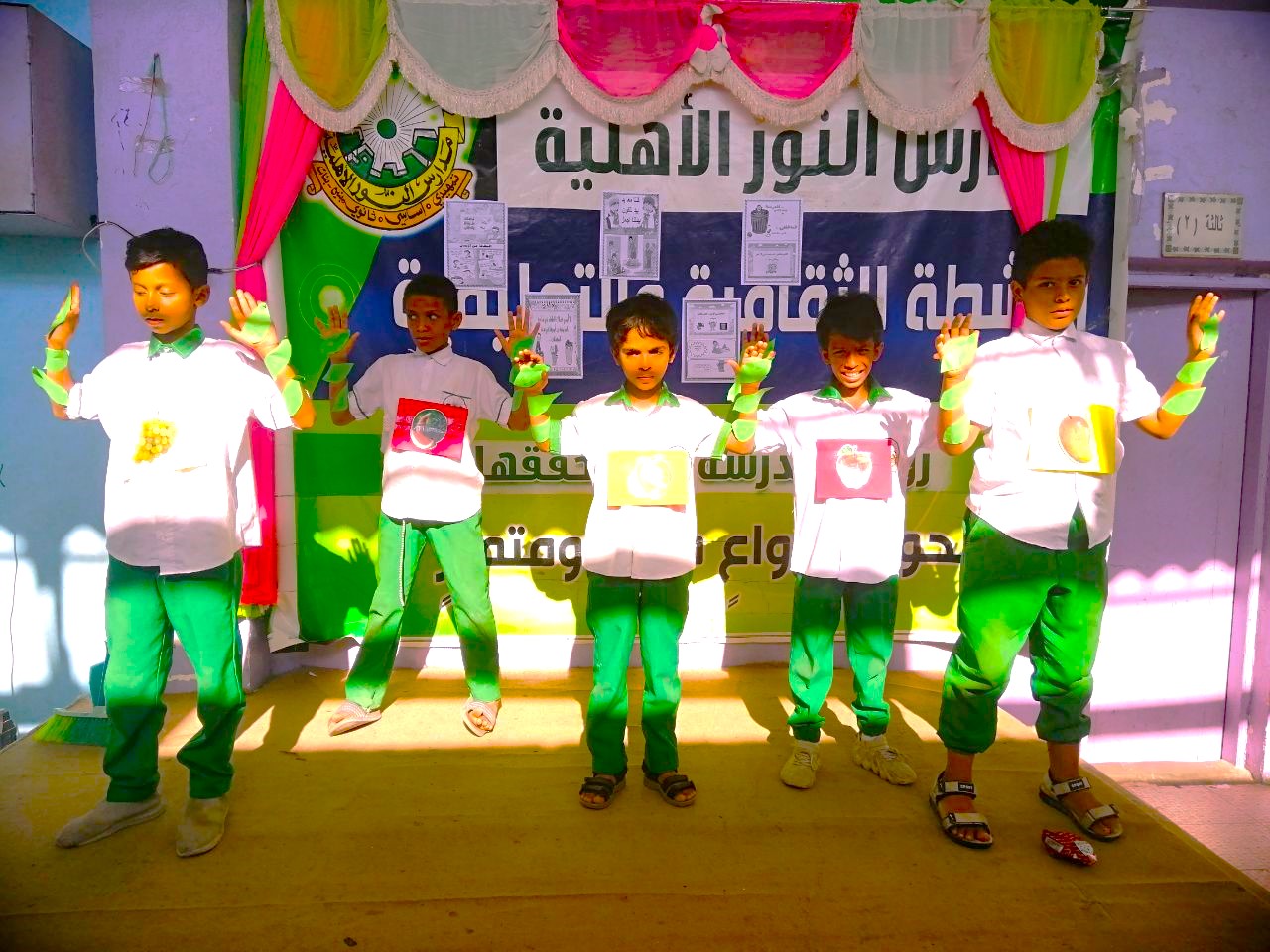 تماشياً مع اليوم العالمي للبيئة والذي يشرف عليه مكتب وزارة التربية والتعليم بساحل حضرموت اختتمت صباح يوم الخميس من الأسبوع الماضي فعاليات أسبوع النظافة والبيئة بمدارس النور الأهلية لفرع المكلا ( القصر ) لتلاميذ وتلميذات الفئة الصغرى ( تمهيدي – رابع ) وقد اشتملت الفعالية على الكلمات التوجيهية والمشاهد والأناشيد والملصقات المعبرة وكذلك عروض تلفزيونية مرئية كما اشتملت الفاعلية مشاركة التلاميذ في تنظيف ساحة المدرسة وتهدف هذه الفعالية إلى غرس حب النظافة في قلوب التلاميذ والتلميذات وقد لاقت الفعالية تفاعل كبير من قبل التلاميذ والتلميذات .